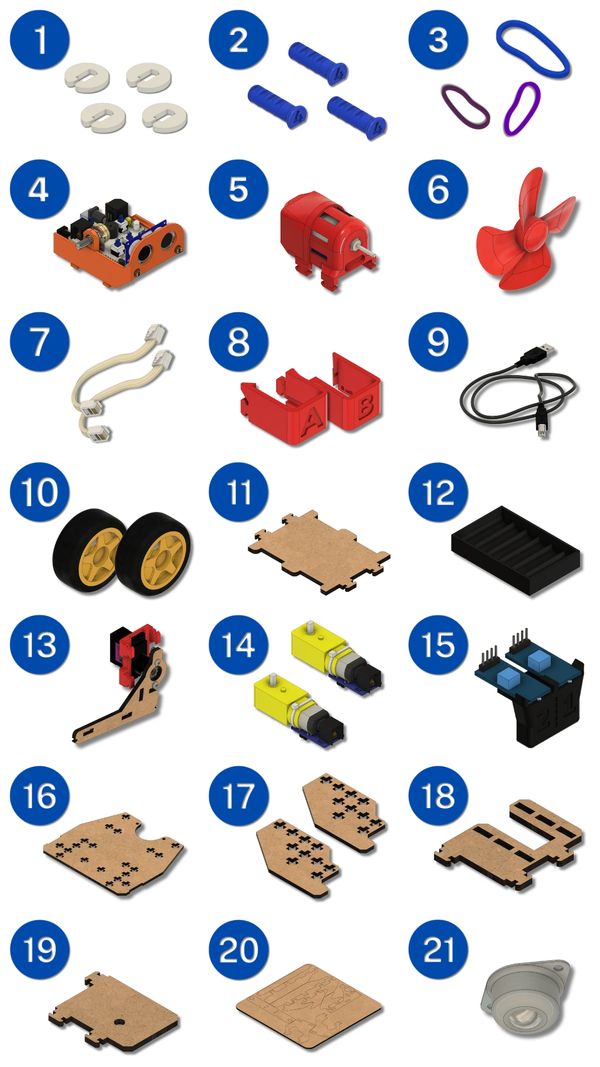 El set completo permite trabajar con tres proyectos secuenciados y con distinto nivel de aprendizaje, permitiendo introducir a los más chicos de forma paulatina y estructurada en temas de diseño 3D, electrónica y programación.
